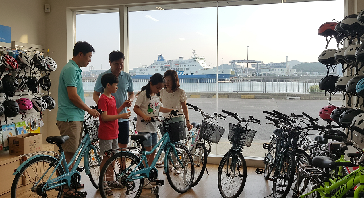 옹진군 신시모도여행에서 자전거 렌탈은 선착장 바로 앞에 있는 렌탈숍에서 가능해요. 신도 선착장에 내리면 바로 보이는 위치에 있어 찾기 쉽답니다. 하이브리드 자전거 기준으로 종일 렌탈 요금은 대략 1만원~1만5천원 선이며, 오전 9시부터 오후 5시까지 운영해요.