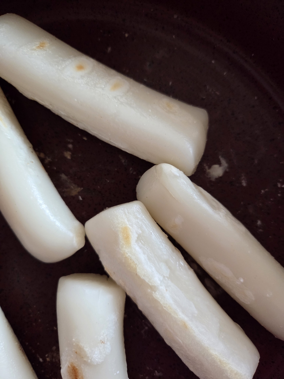 해동과 세척: 냉동된 떡은 찬물에 10분 정도 담가 자연스럽게 해동한 뒤 키친타월로 물기를 완전히 제거해야 겉면이 바삭하게 구워집니다.